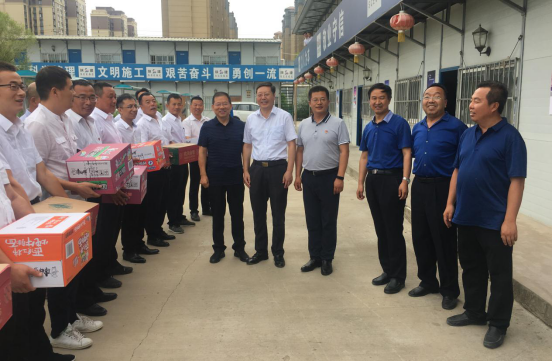 8月9日上午,延安大学校长张金锁,副校长杨伟宏,校办主任刘述进、工会主席白泽生一行到延安大学新校区项目慰问一线职工,陕建十三公司董事长、总经理卜国平一同慰问,延大校办、工会及新校区办公室相关负责人参加慰问活动。