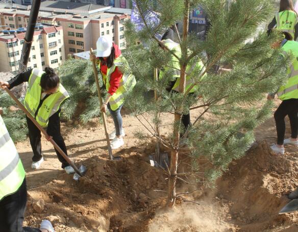 期间,大家互相配合,有的挥锹铲土、有的扶树填土,忙的不亦乐乎。经过一个多小时的努力,40多颗松树在长青路观景台“安家落户”,为那里添上了一片新绿。